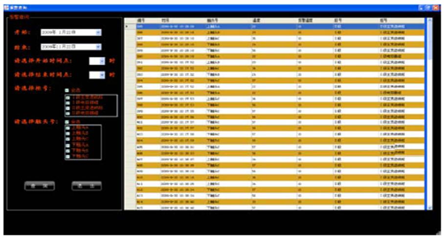 圖6是歷史溫度查詢界面,此界面分為歷史溫度顯示區和查詢設置區。查詢設置區即輸入設置需要查詢的日期、時間。歷史溫度顯示區即顯示需要查詢的數據。