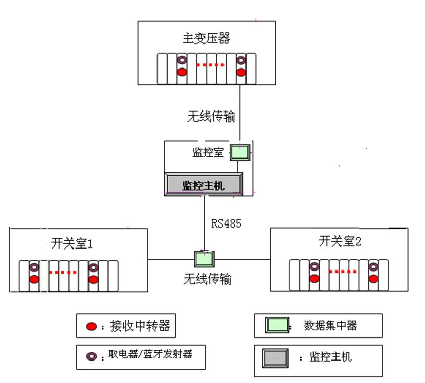 測溫點---(無線)----采集器----(485線)--數據處理主機