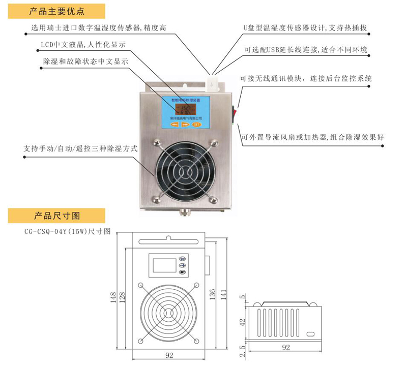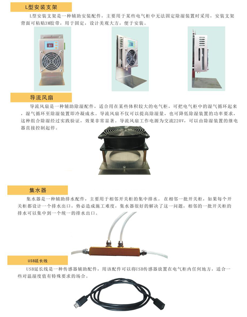 、安裝方便、外形美觀、體積小巧、可插拔溫濕度USB傳感器、 可外置導流風扇、 具備故障提示、具備RS-485接口等特點。功率范圍可覆蓋15W 120W,滿足了各種柜型的除濕需求。