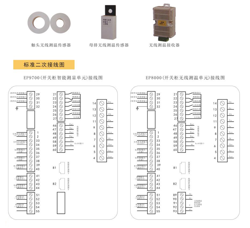 EP9700不僅具有動態模擬圖、柜內溫濕度數字顯示及可編程控制、語音防誤提示、帶電顯示及閉鎖、操控轉換開關(包括儲能開關、遠方/就地轉換開關、分合閘轉換開關)、RS485數字通訊等功能,其還集成了多功能電能表的全部功能,可同時測量顯示多種電力參數:三相電壓、三相電流、有功功率、無功功率、功率因數、頻率,并計量有功電能和無功電能。EP9800除了具有EP9700所有功能外, 另可與位置無線測溫傳感器或遠紅外有線測溫傳感器配合使用, 可在線測量母排、斷路器觸頭、電纜搭接頭等多處實時溫度。
