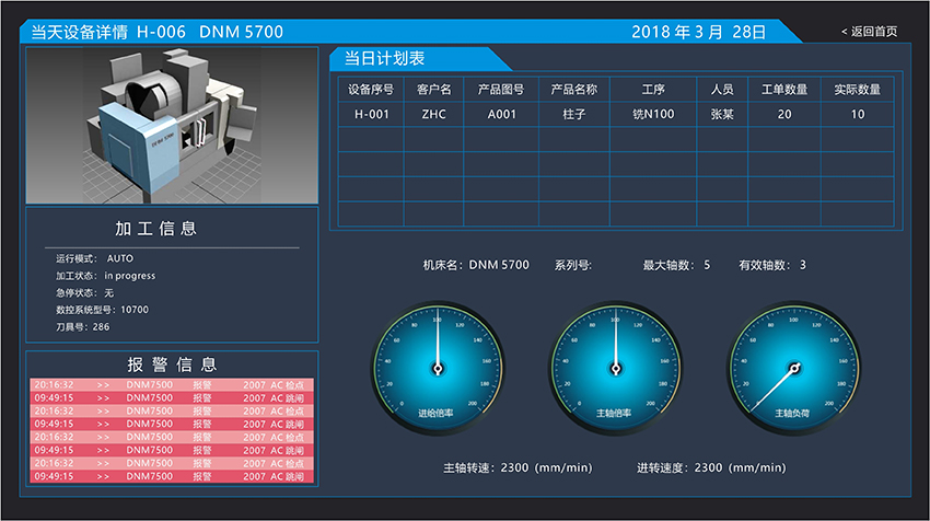 對于每個機床的設備狀態:是否開機、待機、報警,是否在加工程序,每個零件的實際加工時間等數據進行采集,最后實現統計分析,為科學決策提供數據支撐。