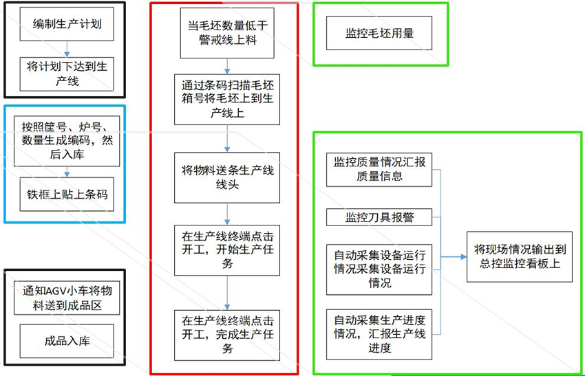 智能車間整體方案實施:多條自動化生產線、AGV小車和智能倉儲組成智能車間。